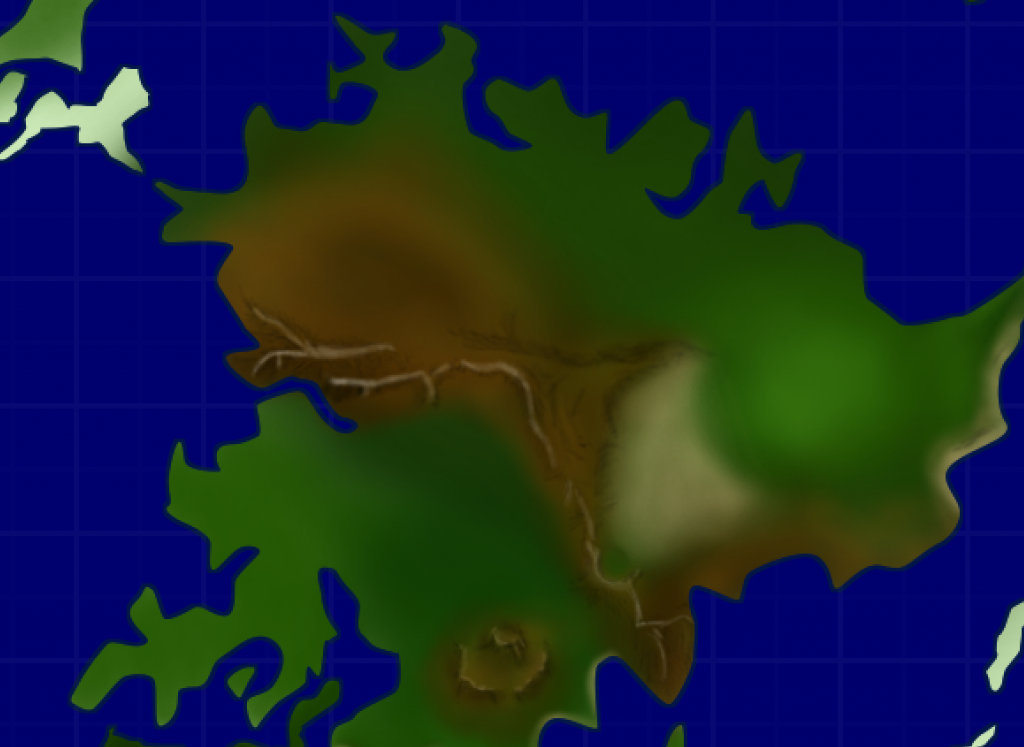 Still thinking this will be a digital project, I’m still working in RGB but upped the size of the canvas and worked with 300 dpi. This time I actually had some progress done on the Northern Crater and I was really happy with how that part turned out. But then sometime during this map, I wasn’t really happy with the quality of it overall. The overall land mass shape, was what I was not happy with it, as there were some parts of the map that were missing and I knew that would bug the hell out of me if I didn’t fix it. I had also noticed when I would zoom in at 200%, that the document was pixelized. Right then I knew, that it had to be redone.